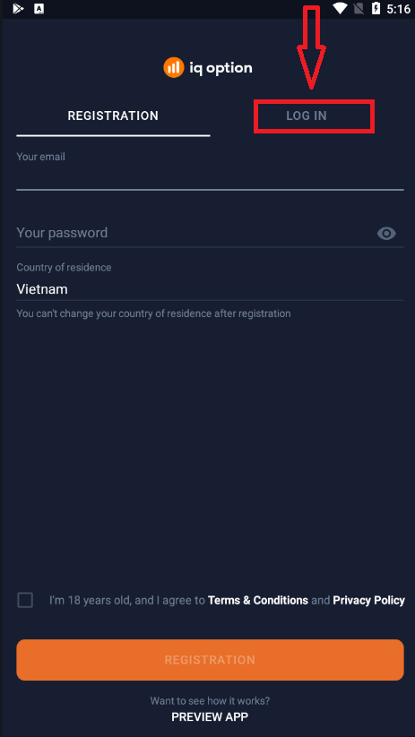 Efter installation og lancering kan du logge ind på IQ Option Android-mobilappen ved at bruge din e-mail, Facebook eller Google-konto.